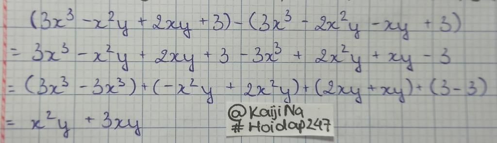 `(3x^3 - x^2y + 2xy + 3) - (3x^3 - 2x^2y - xy + 3)`