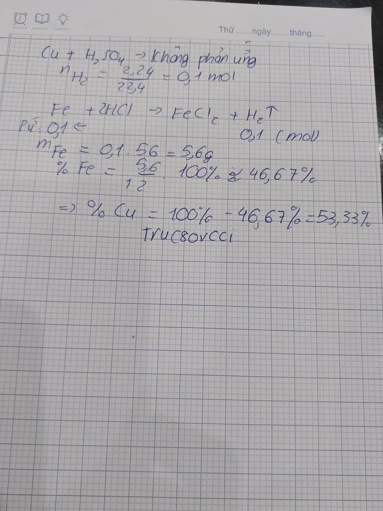 Cho 12g hỗn hợp chứa 2 kim loại: Sắt và Đồng vào dung dịch H2SO4 loãng dư thu được 2,24L khí Hidro ở đktc