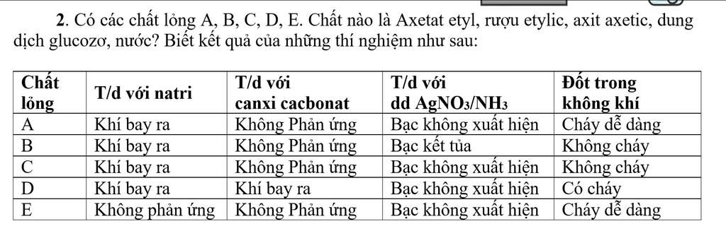 Chất $D$ tác dụng với $CaCO_3$ có khí bay ra nên $D$ có nhóm axit. Vậy $D$ là axit axetic $CH_3COOH$. $D$ là chất lỏng hữu cơ tinh khiết nên cháy được trong không khí.