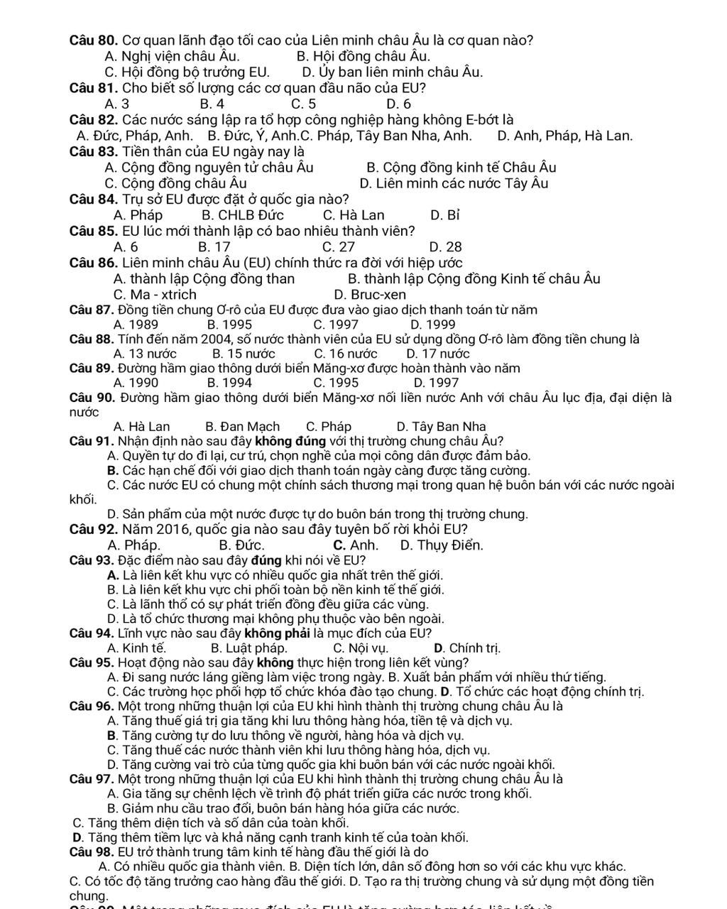 Câu 86. Liên minh châu Âu (EU) chính thức ra đời với hiệp ước