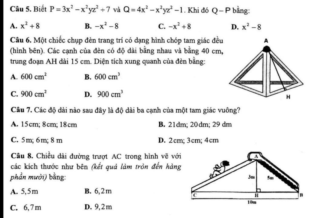 Câu 5. Biết P = 3x’ −x’yz +7 và Q=4x’ − x’yz −1. Khi đó Q−P bằng: