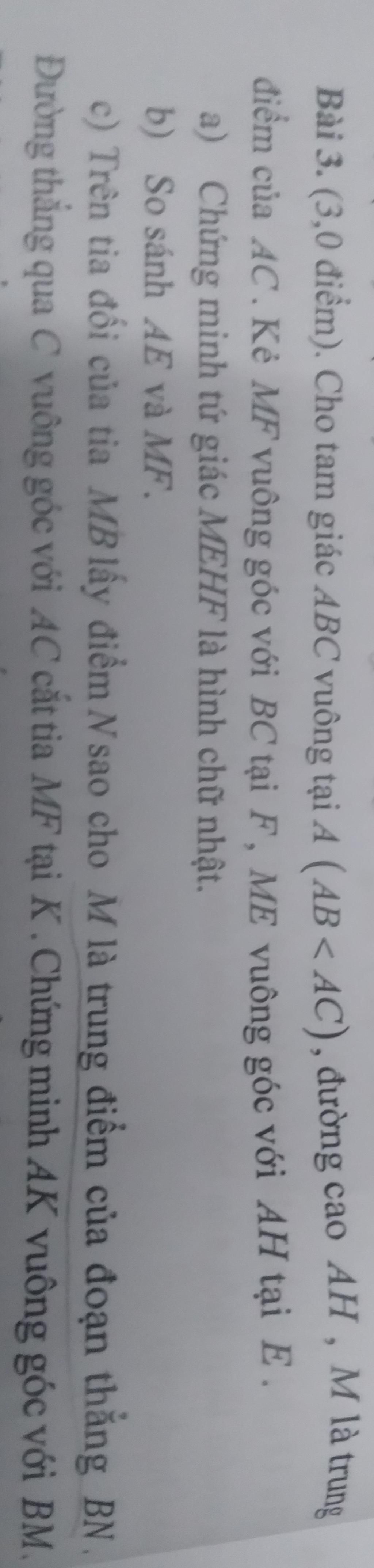 a.Ta có: $ME\perp AH, MF\perp BC, AH\perp BC$