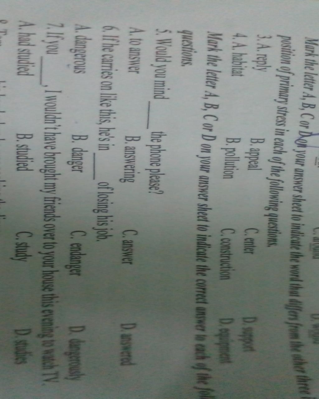 Mark the letter A, B, C or Don your answer sheet to indicate the word that differs from the other three