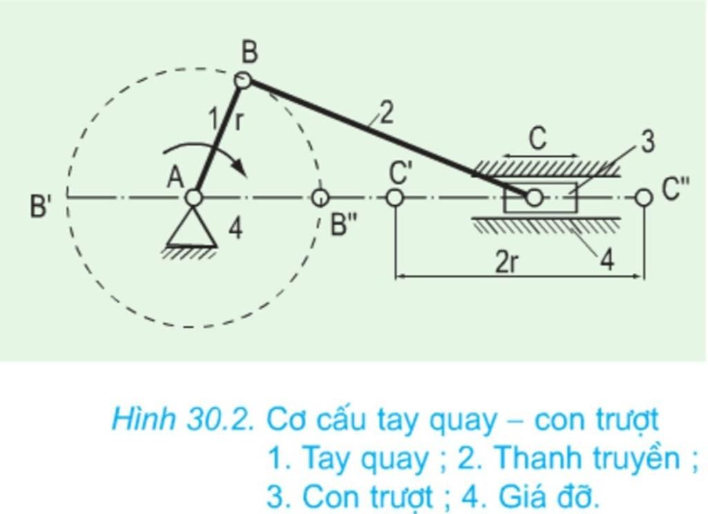 Khi tay quay 1 quay quanh trục A, đầu B của thanh truyền 2 chuyển động tròn làm con trượt 3 chuyển động tịnh tiến qua lại trên giá đỡ 4