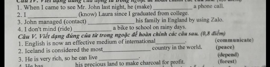 Câu V. Viết dạng đúng của từ trong ng ...