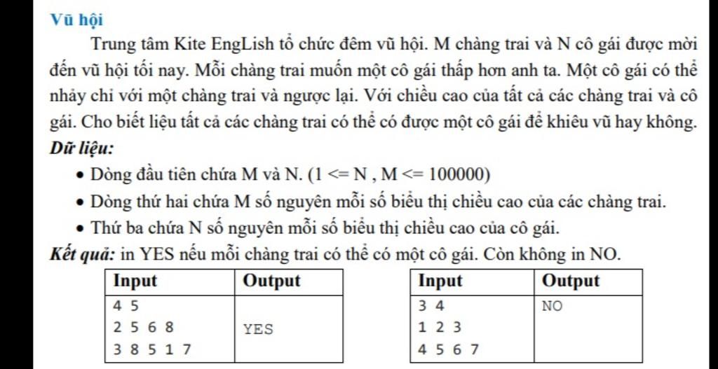 Trung tâm Kite EngLish tổ chức đêm vũ hội. M chàng trai và N cô gái được mời