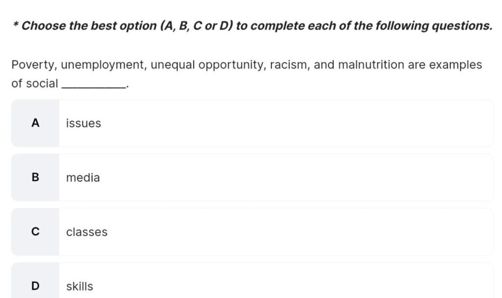 `-` xét nghĩa: đói nghèo, thất nghiệp, cơ hội không bình đẳng , phân biệt chủng tộc và suy thoái kinh tế là những ví dụ về các.... xã hội