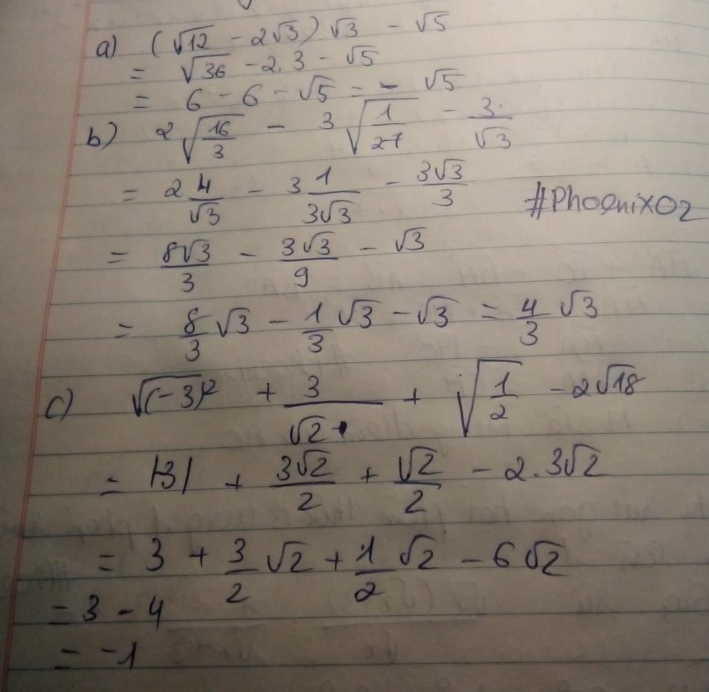 `a) ( \sqrt{12} - 2 \sqrt{3} ). \sqrt{3} - \sqrt{5}`