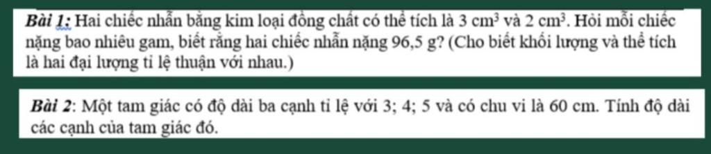 Vì hai chiếc nhẫn bằng kim loại đồng chất có thể tích là `3cm^3` và `2cm^3` nên: