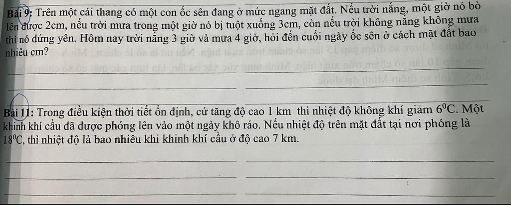 thì nó đứng yên. Hôm nay trời nắng 3 giờ và mưa 4 giờ, hỏi đến cuối ngày ốc sên ở cách mặt ...