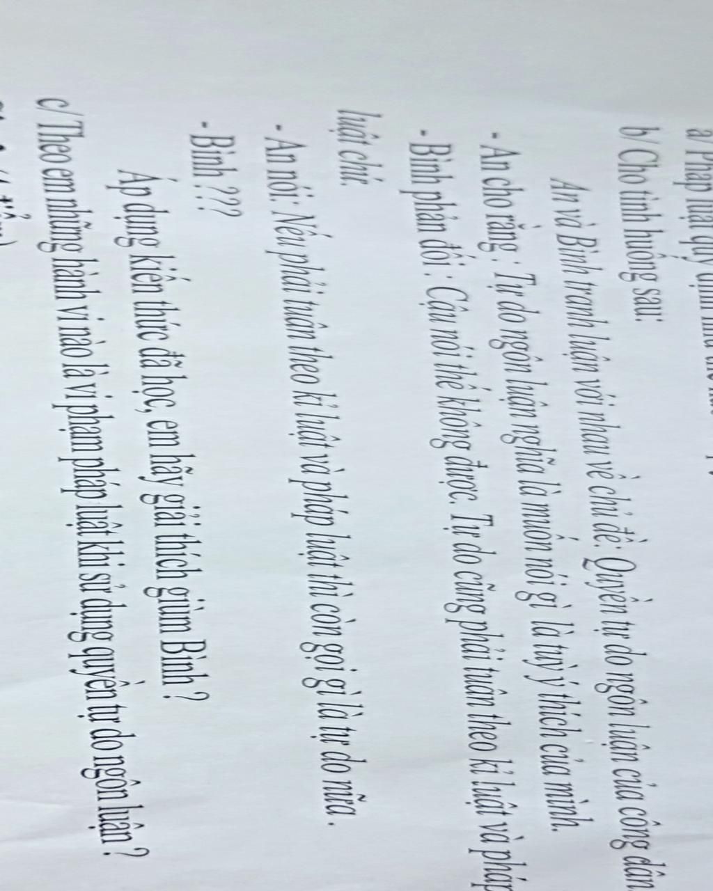 b. Tự do ngôn luận là quyền của công dân để tự do thể hiện ý kiến của mình, nhưng đồng thời cũng phải tuân theo kỉ luật và pháp luật của quốc gia. Việc tuân theo pháp luật và kỉ luật này không làm giảm đi tính tự do ngôn luận mà ngược lại, đảm bảo rằng tự do ngôn luận không phá hoại trật tự an ninh và xã hội.