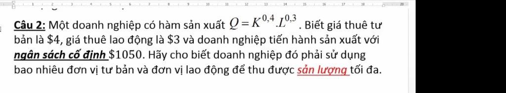 Câu 2: Một doanh nghiệp có hàm sản xuất Q=K04 L0,3 . Biết giá thuê tư