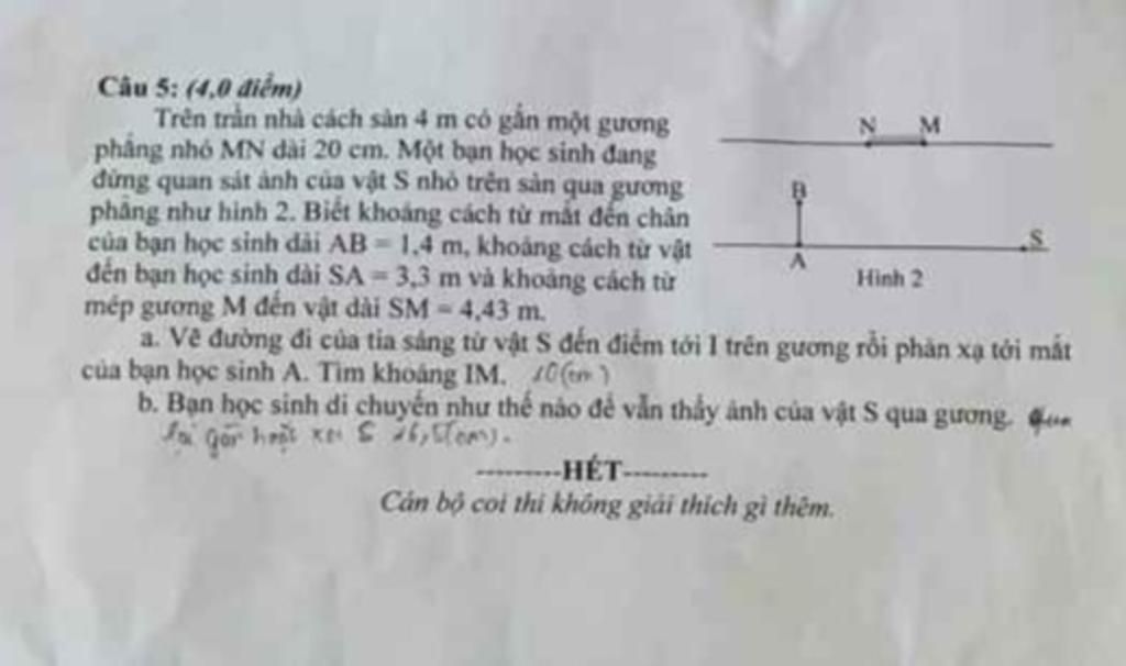 Trên trần nhà cách sàn 4 m có gắn một gương