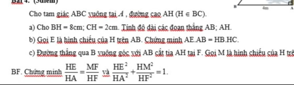 Cho tam giác ABC vuông tại 4, đường sao AH (H = BC).
