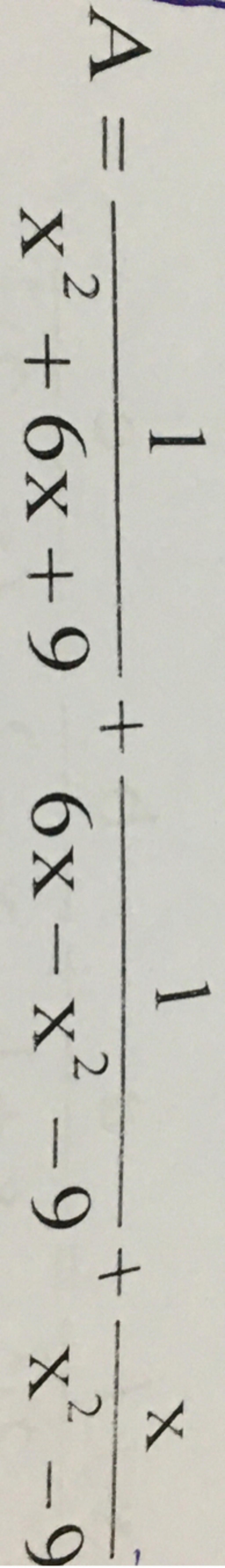 `=> A = 1/(x^2+ 6x + 9) - 1/(x^2 - 6x + 9) + x/(x^2 - 9)`