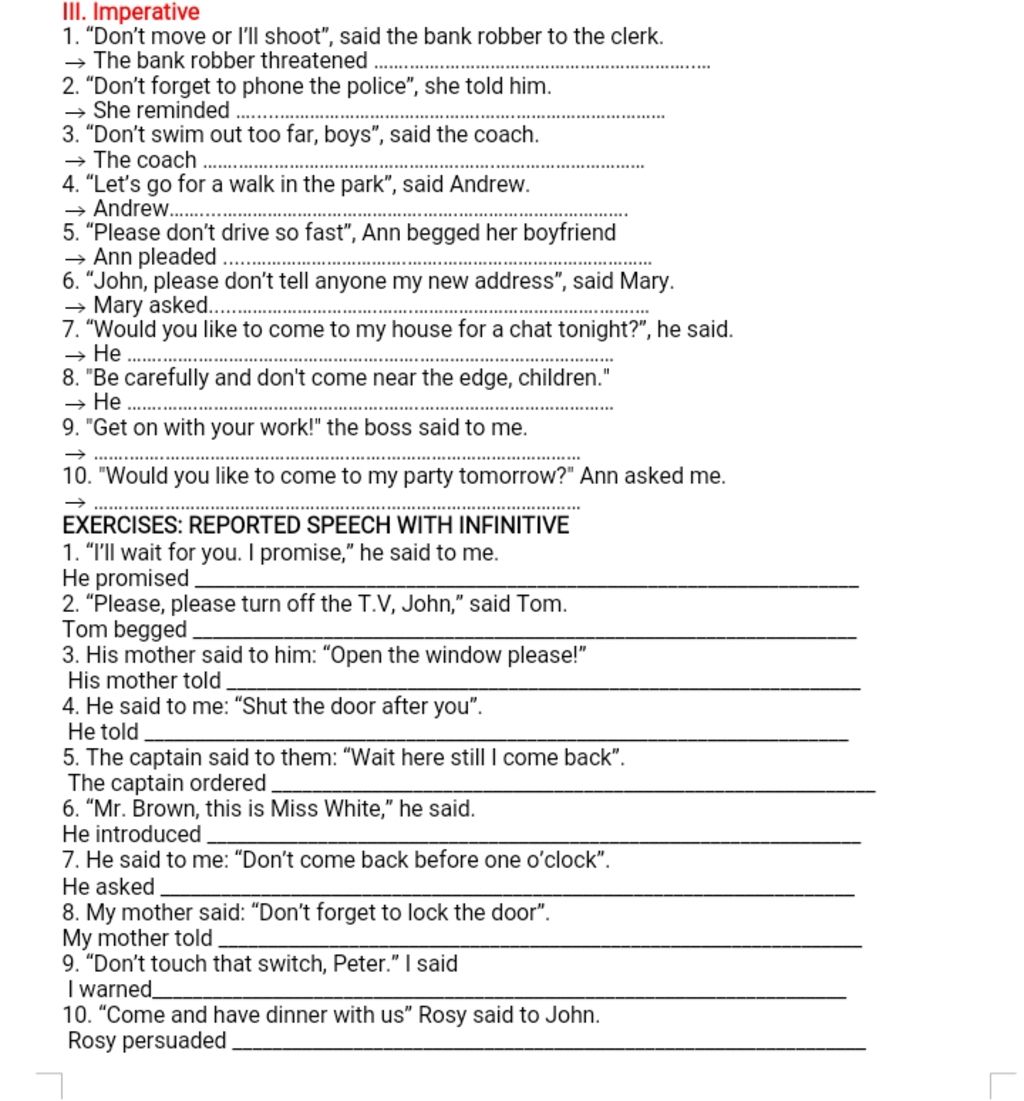 1, The bank robber threatened the clerk not to move or he would shoot.