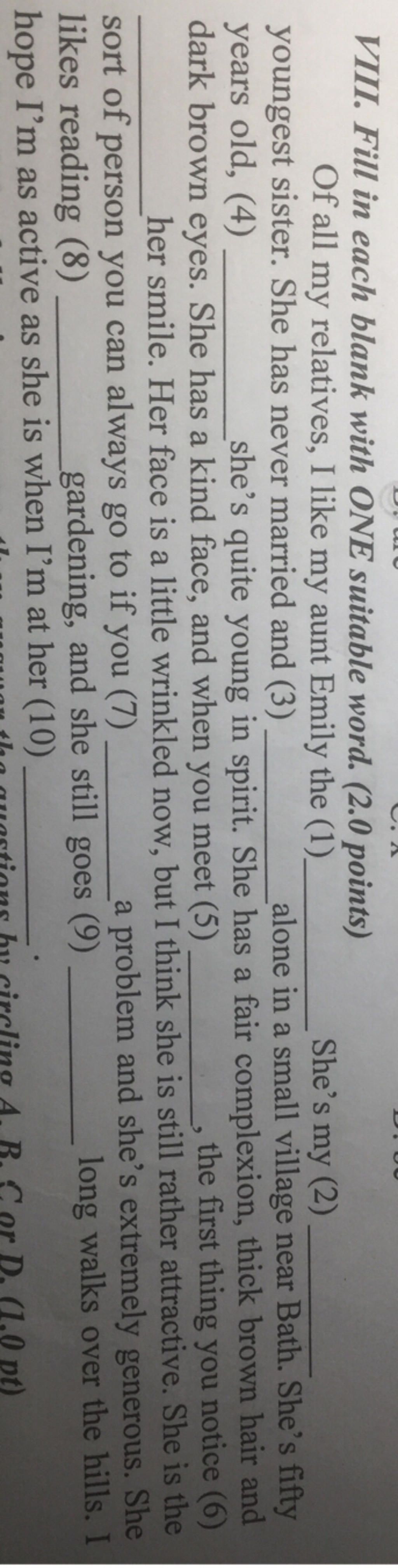 VIII. Fill in each blank with ONE suitable word. (2.0 points)