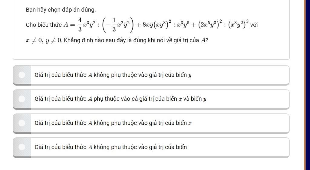 $\Rightarrow$ Giá trị của biểu thức $A$ phụ thuộc vào cả giá trị của biến $x$ và biến $y.$