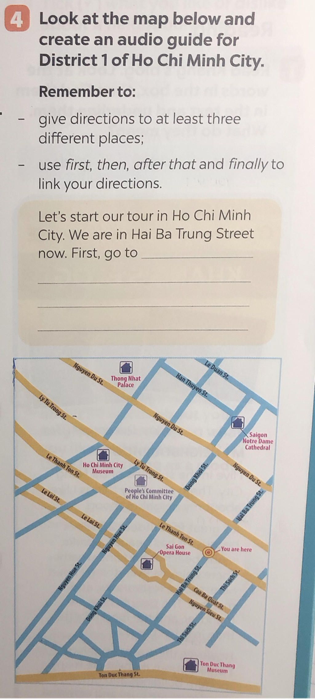 Mọi người giúp em bài 4 với ạ . Nêu cách chỉ đường ít nhất cho 3 địa điểm ạ , nhớ định tiếng việt giúp em ạ