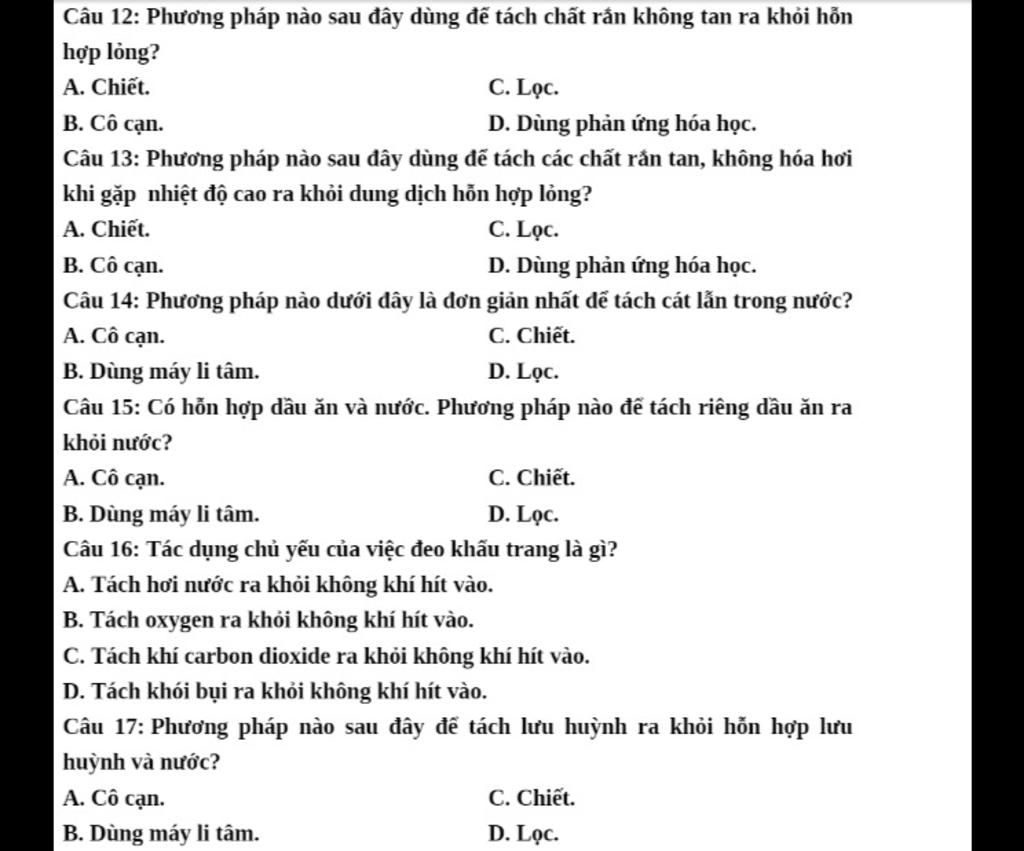 Câu 12: Phương pháp nào sau đây dùng để tách chất rắn không tan ra khỏi hỗn