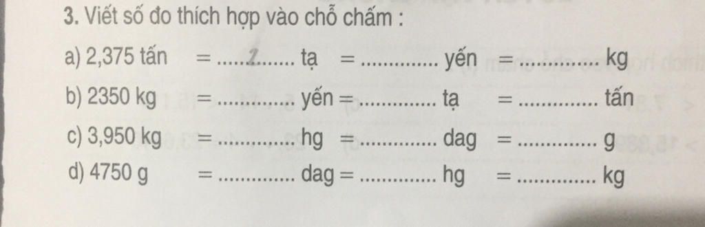 a) 2, 375 tấn = 23,75 tạ = 237,5 yến = 2375 kg.