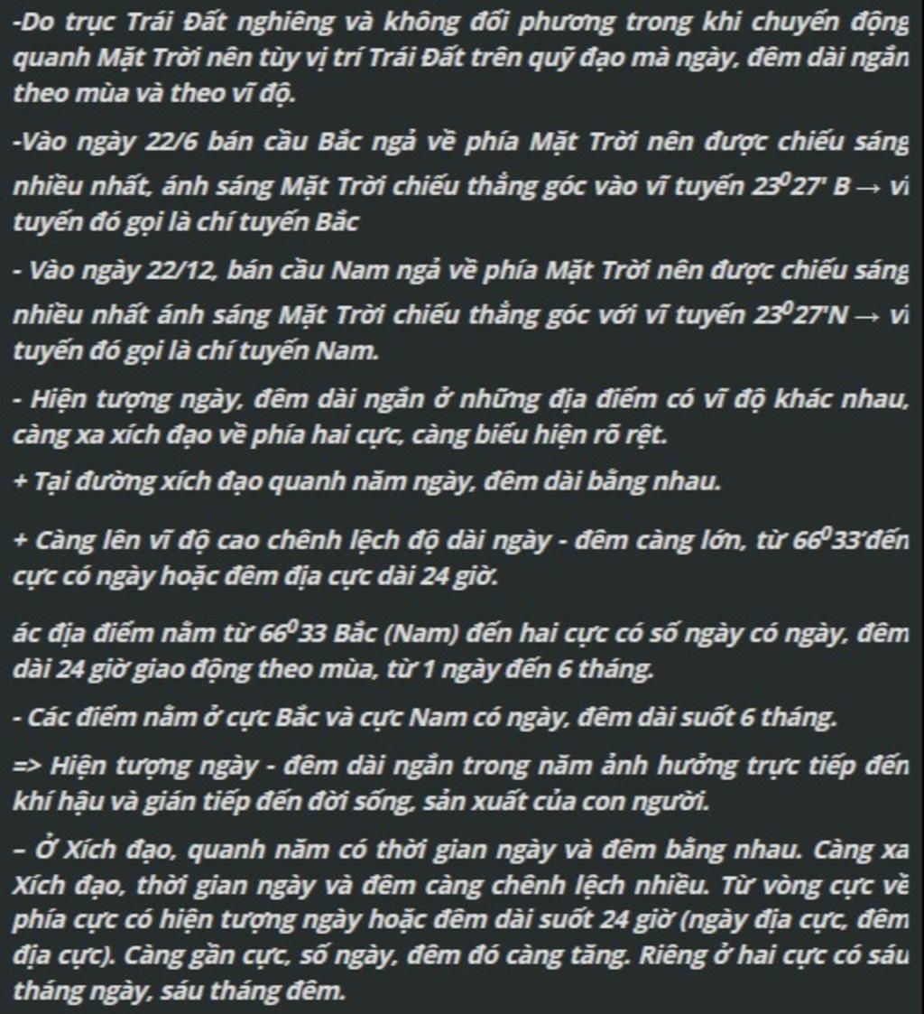 – Ở Xích đạo, quanh năm có thời gian ngày và đêm bằng nhau. Càng xa Xích đạo, thời gian ngày và đêm càng chênh lệch nhiều. Từ vòng cực về phía cực có hiện tượng ngày hoặc đêm dài suốt 24 giờ (ngày địa cực, đêm địa cực). Càng gần cực, số ngày, đêm đó càng tăng. Riêng ở hai cực có sáu tháng ngày, sáu tháng đêm.