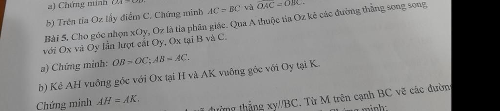 Bài 5. Cho góc nhọn xOy, Oz là tia phân giác. Qua A thuộc tia Oz kẻ các đường thẳng song song