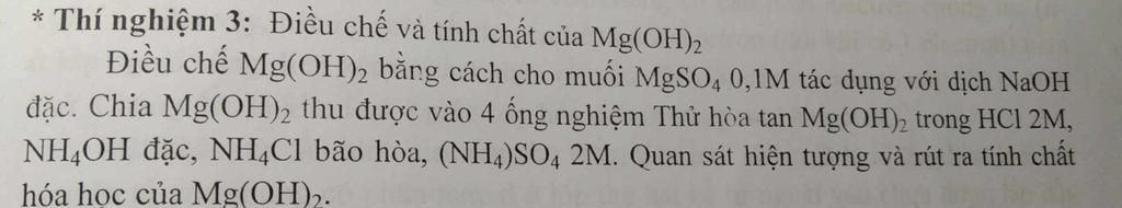 * Thí nghiệm 3: Điều chế và tính chất của Mg(OH)2