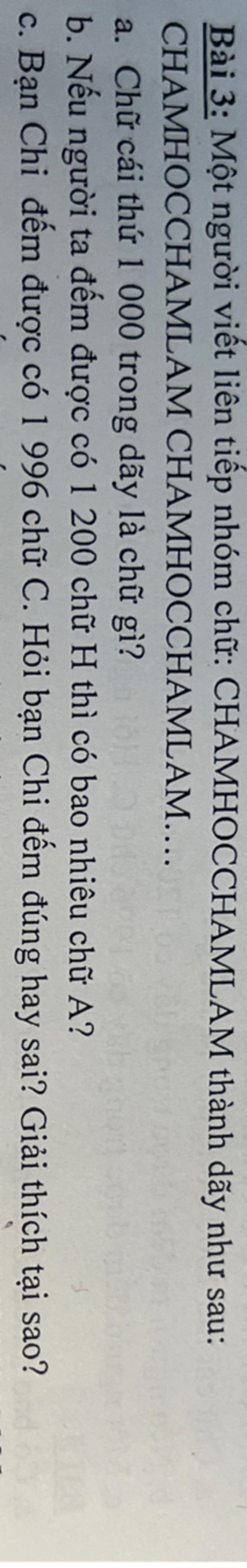 c)Vì trong dãy có 3 chữ C nên nếu bạn Chi đếm dc 1996 chữ C thì bạn đếm sai vì 1996 ko chia hết cho 3.