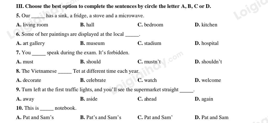 - "bồn rửa, tủ lạnh, bếp và lò vi sóng" là những thứ nằm trong khu vực nhà bếp, kitchen (n) nhà bếp