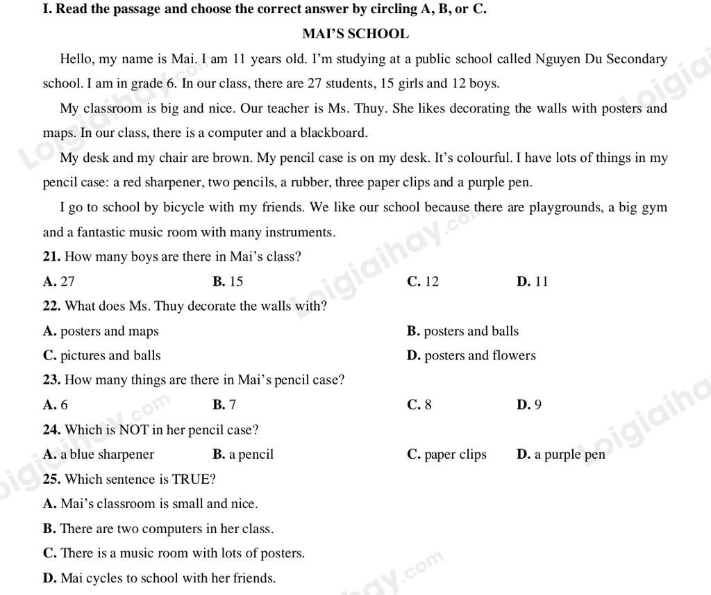 Dẫn chứng: I am in grade 6. In our class, there are 27 students, 15 girls and 12 boys.