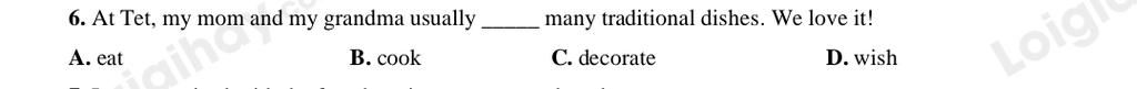 `-` Tạm dịch : Vào ngày Tết , mẹ tôi và bà tôi thường nấu nhiều móm ăn truyền thống . Chúng tôi rất thích .