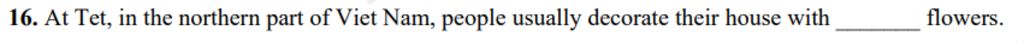 `->` Vào dịp Tết, ở miền Bắc Việt Nam, người ta thường trang trí nhà bằng hoa ______.