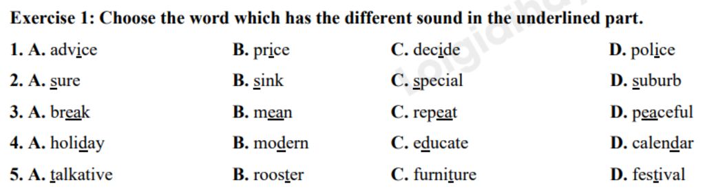 `1.D` phát âm là /iː/, còn lại phát âm là /aɪ/.