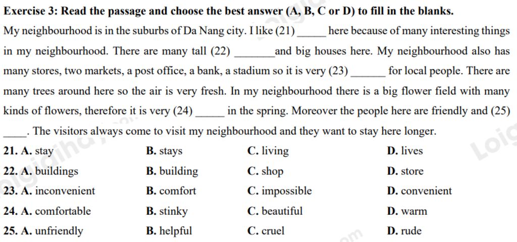 My neighbourhood is in the suburbs of Da Nang city. I like (21)