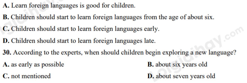 Dẫn chứng: In addition, they say that children should start to learn foreign languages as early as possible, from the age of about six - early >< late
