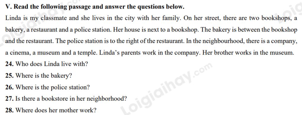 `-` Thông tin: On her street, there are two bookshops, a bakery, a restaurant and a police station.