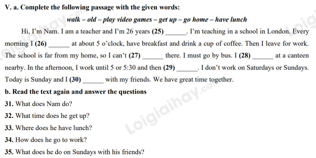 * Những chỗ trống ở các câu 26, 28, 29, 30 thì bạn phải dựa vào nghĩa để điền nhé, vì đây là những hành động xảy ra theo một lịch trình nhất định trong ngày nên sẽ không có cấu trúc hay bằng chứng ở các câu trước nó để suy đoán hay điền ạ