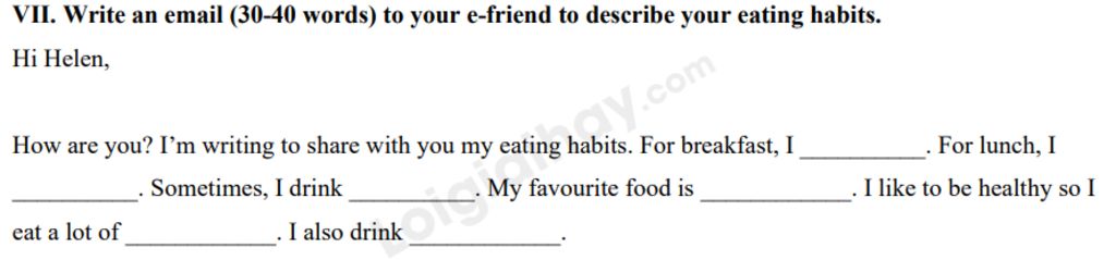 How are you? I’m writing to share with you my eating habits. For breakfast, I __often eat bread with eggs and drinks milk__. For lunch, I __always eat rice, fish, meat and vegetable soup__. Sometimes, I drink __orange juice or apple juice_. My favourite food is ___salad__. I like to be healthy so I eat a lot of __fruit and vegetables___. I also drink __milk and fruit juice____.