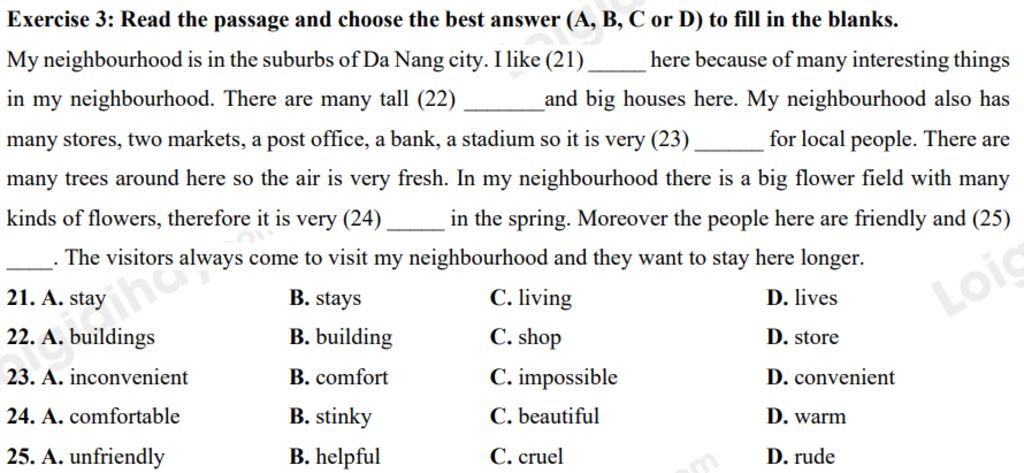 `-` Tạm dịch : Khu tôi ở cũng có rất nhiều cửa hàng , hai cái chợ , một cái bưu điện, một ngân hàng , một cái sân vận động nên rất thuận tiện cho người dân địa phương .