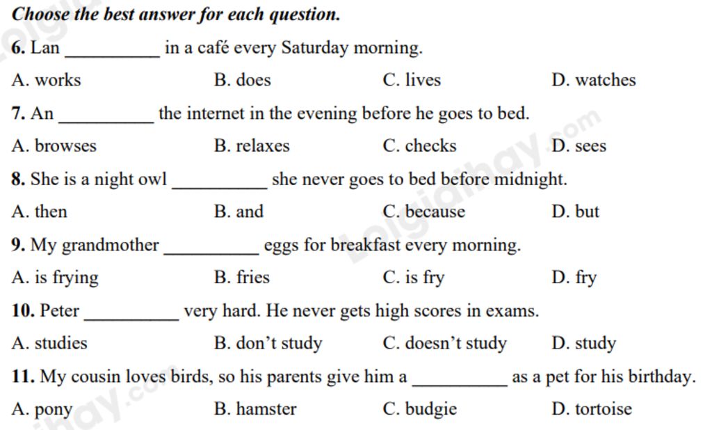 `=>` budgie ( Vì " My cousin loves birds " : anh họ tôi thích chim )