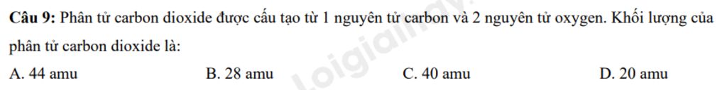 Câu 9: Phân tử carbon dioxide được cấu tạo từ 1 nguyên tử carbon và 2 nguyên tử oxygen. Khối lượng của phân tử carbon dioxide là: