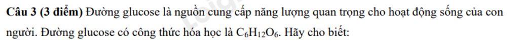 Câu 3 (3 điểm) Đường glucose là nguồn cung cấp năng lượng quan trọng cho hoạt động sống của con người. Đường glucose có công thức hóa học là C6H12O6. Hãy cho biết: