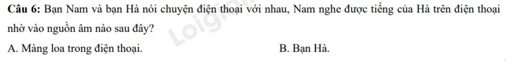 Câu 6: Bạn Nam và bạn Hà nói chuyện điện thoại với nhau, Nam nghe được tiếng của Hà trên điện thoại nhờ vào nguồn âm nào sau đây?
