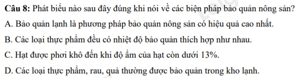 Câu 8: Phát biểu nào sau đây đúng khi nói về các biện pháp bảo quản nông sản?