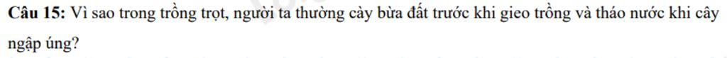 Câu 15: Vì sao trong trồng trọt, người ta thường cày bừa đất trước khi gieo trồng và tháo nước khi cây ngập úng?