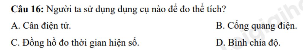 Câu 16: Người ta sử dụng dụng cụ nào để đo thể tích?