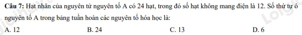 Câu 7: Hạt nhân của nguyên tử nguyên tố A có 24 hạt, trong đó số hạt không mang điện là 12. Số thứ tự ô nguyên tố A trong bảng tuần hoàn các nguyên tố hóa học là: