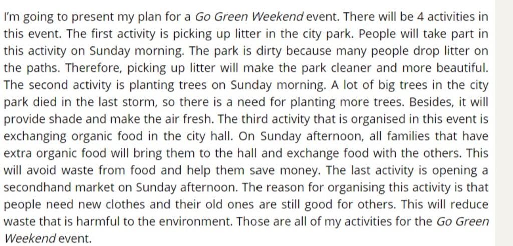 Work in groups. Make a plan for a Go Green Weekend event. Think of activities that you can organise during the weekend. You should also provide the reasons and expected results of each activity you suggest.