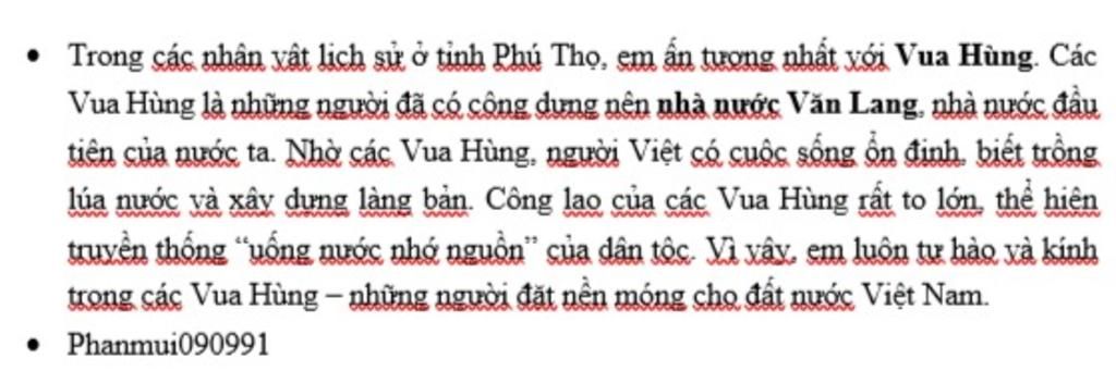 `@` Tham khảo `:` Nhân vật lịch sử ở Phú Thọ mà tôi ấn tượng nhất chính là Vua Hùng Vương. Ông là người sáng lập và lãnh đạo dòng họ Hùng, cũng như là người đứng đầu của nước Văn Lang - nơi được xem là tiền thân của đất nước Việt Nam ngày nay. Vua Hùng Vương được mô tả là người có trí tuệ và tài năng lãnh đạo xuất chúng, ông đã đưa đất nước đi lên từ những khó khăn ban đầu và xây dựng nên một triều đại vững mạnh. Với tình cảm sâu sắc đối với đất nước và nhân dân, Vua Hùng Vương đã để lại một di sản văn hóa vô giá cho người dân Phú Thọ và cả đất nước Việt Nam.
